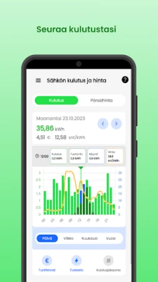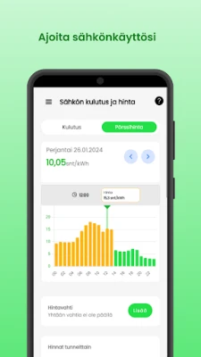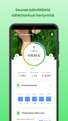 Haluatko todellisen otteen kotisi energiankulutukseen? Tämä sovellus tarjoaa kattavan näkymän sähkön käyttöön, auttaen sinua ymmärtämään ja hallitsemaan energiamenojasi ennennäkemättömällä tarkkuudella. Näet vaivattomasti tämän kuukauden kertyneen laskun, keskihinnan ja kulutusvaikutuksen, sekä sähkön hinnat jopa viisi tuntia etukäteen. Sähkö-osiosta löydät yksityiskohtaisen erittelyn kulutuksestasi, jotta tiedät tarkalleen mihin energiaa kuluu. Älykkäät hinta-, kulutus- ja laitevahdit pitävät sinut ajan tasalla markkinahintojen heilahteluista ja auttavat optimoimaan laitteidesi käyttöä.