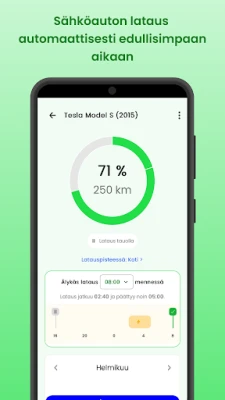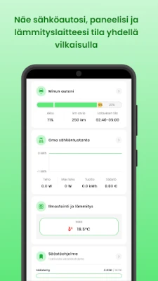 Hyödynnä sovelluksen älykkäitä ominaisuuksia ja anna kodin toimia puolestasi. Se ohjaa sähköautosi latauksen automaattisesti pörssisähkön edullisimmille tunneille, maksimoiden säästöt ilman vaivannäköä. Jos käytössäsi on aurinkopaneeleja, näet niiden tuotantotiedot selkeästi. Lisäksi sovellus kykenee ohjaamaan kotisi lämmityslaitteita energiatehokkaasti, mikä takaa miellyttävän sisälämpötilan ja pienemmän laskun. Kaikki nämä toiminnot ovat käden ulottuvilla, helposti hallittavissa suoraan etusivulta, tehden arjestasi sujuvampaa ja ekologisempaa.