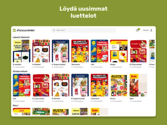 Säästä aikaa ja rahaa arjessasi. Tämä monitoimityökalu kokoaa kätevästi kauppojen tarjoukset ja mainoslehdet yhteen paikkaan. Löydä parhaat diilit ruoasta, tee-se-itse -tuotteista, sisustuksesta, elektroniikasta ja muualta.