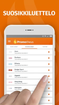 Mutta Promotheus on paljon enemmän kuin vain paikallinen etukäteispeli. Kaipaatko inspiraatiota ostoksille ulkomailla? Sovellus avaa pääsyn satojen kansainvälisten jälleenmyyjien tarjousmaailmaan yli 20 eri maassa, tehden matkoistasi entistäkin budjettiystävällisempiä. Eikä huolta verkkoyhteydestä: voit tallentaa haluamasi tarjouslehdet laitteellesi ja selata niitä mukavasti missä tahansa ja milloin tahansa, vaikka ostosreissulla kaupan hyllyjen välissä. Unohda muistilaput ja paperiset listat – luo oma henkilökohtainen ostoslistasi suoraan tarjouslehdistä poimimalla, jotta yksikään alennustuote ei jää enää hyllyyn.
