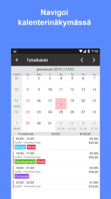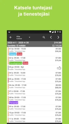 Timesheet: Kellokortti Työajat on helppo sovellus työajan seurantaan ja lokiin. Se sopii freelancereille, urakoitsijoille ja tuntityöntekijöille, auttaen tuntien ja ansioiden automaattisessa laskennassa. Hallitse työaikasi ja laskuta asiakkaita vaivattomasti useiden projektien osalta.