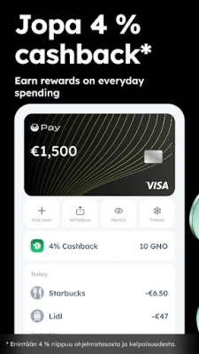 Maailma on kirjaimellisesti ulottuvillasi Zeal Visa® -debitkortin ansiosta. Maksa yli 150 maassa huoletta, sillä Zeal eliminoi valuutanvaihtokulut ja tarjoaa aina Visan reilun kurssin ilman yllättäviä lisämaksuja. Saat lisäksi jopa 4 % cashbackia ostoksistasi, muuttaen arjen kulutuksen palkinnoiksi. Aktivoi virtuaalikortti välittömästi verkko-ostoksiin tai lisää se Google Walletiin nauttiaksesi lähimaksujen mukavuudesta. Matkusta, shoppaile ja elä globaalisti ilman huolta valuutanvaihdosta tai kuluista.