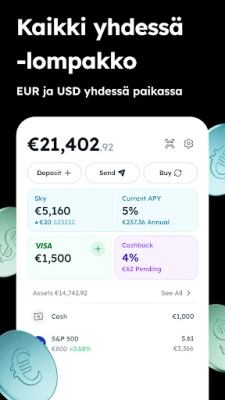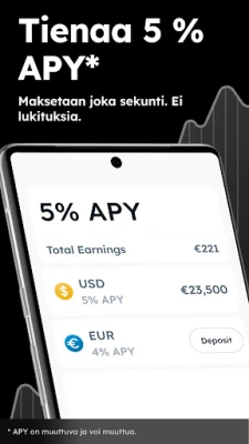 Anna varoillesi uusi suunta Zealin avulla. Koe vaivaton taloudenhallinta, jossa rahasi työskentelevät puolestasi tuottaen jopa 5 %* APY:n EUR- ja USD-saldoille. Zealin joustavassa mallissa ei ole piilotettuja sitoumuksia tai minimitalletuksia; voit käyttää tai nostaa varojasi juuri silloin, kun niitä tarvitset. Nauti reaaliaikaisesta koron kertymisestä ja tehosta säästöjesi kasvua jokaisella ohikiitävällä sekunnilla. Zealin avulla taloutesi on aina liikkeessä, tarjoten sinulle uudenlaista vapautta ja mielenrauhaa.